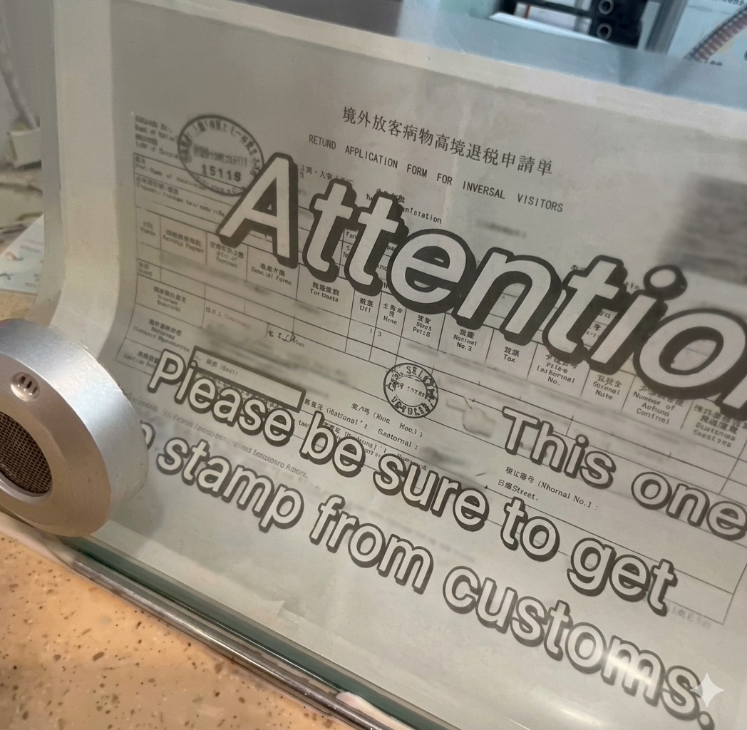 Tempat terdekat nggak jauh dari tempat imigrasi. Jalan lurus sampe mentok, kemudian belok kanan. Nggak jauh dari situ ada counter tax refund di sisi sebelah kanan. Di sini lah tiba pengalaman yang kurang menyenangkan. Saat memberikan berkas ke petugas, petugasnya bilang bahwa dokumennya belum dicap oleh petugas Custom Inspection yang di depan. Itu wajib harus dicap dan kita diminta untuk keluar lagi minta dokumen untuk dicap ke petugas Custom Inspection. Saya bilang bahwa barang sudah di-inspect, sudah difoto dan diinput ke sistem oleh petugas di depan, jadi harusnya sudah di-approve, lihat aja ke sistem. Petugasnya nggak mau tau, menekankan bahwa berkas harus dicap sambil mengembalikan berkas tersebut.