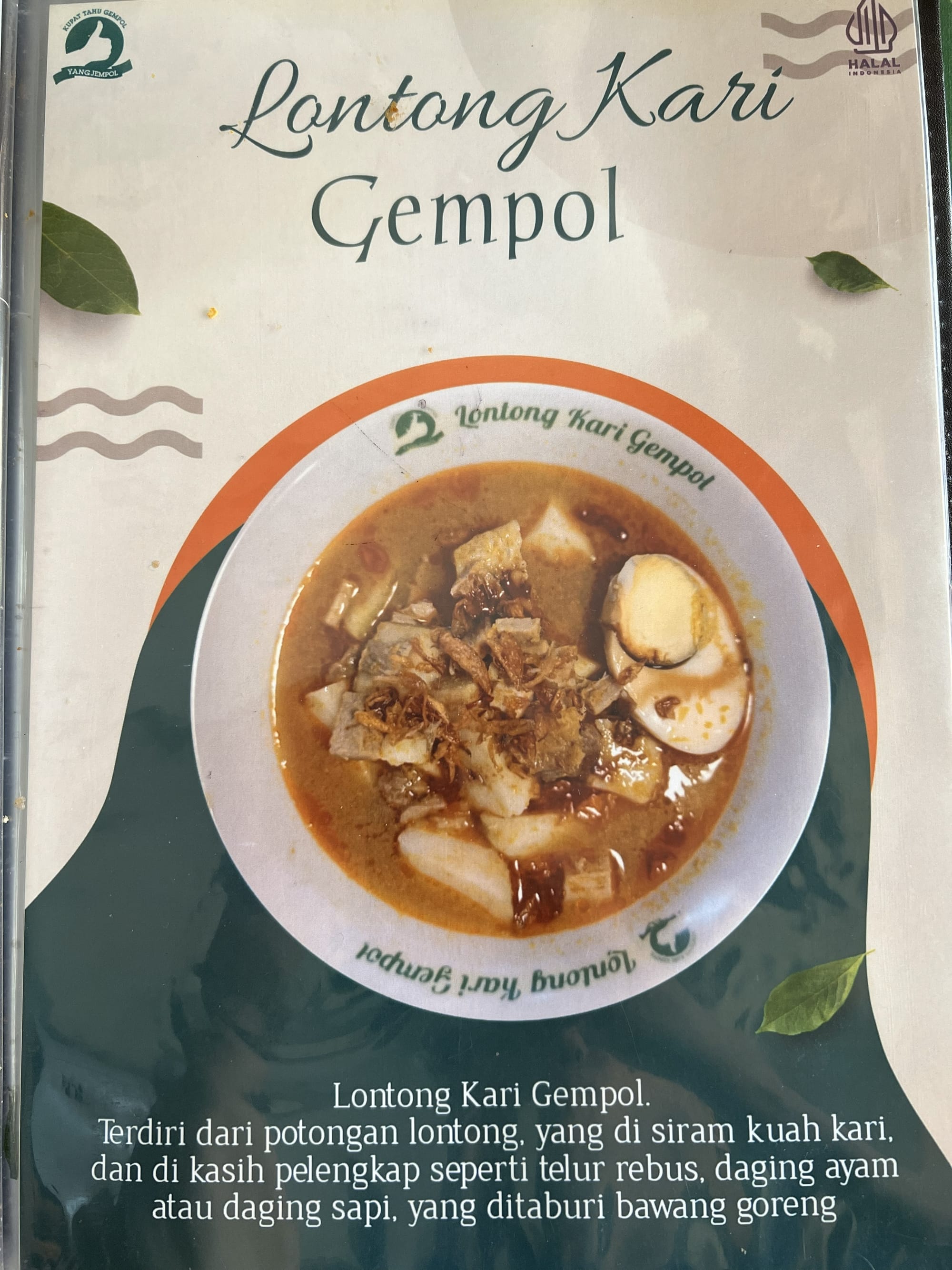 Kalau berdasarkan keterangan di menunya: Terdiri dari potongan lontong, yang disiram kuah kari, dan dikasih pelengkap seperti telur rebus, daging ayam atau daging sapi, yang ditaburi bawang goreng.